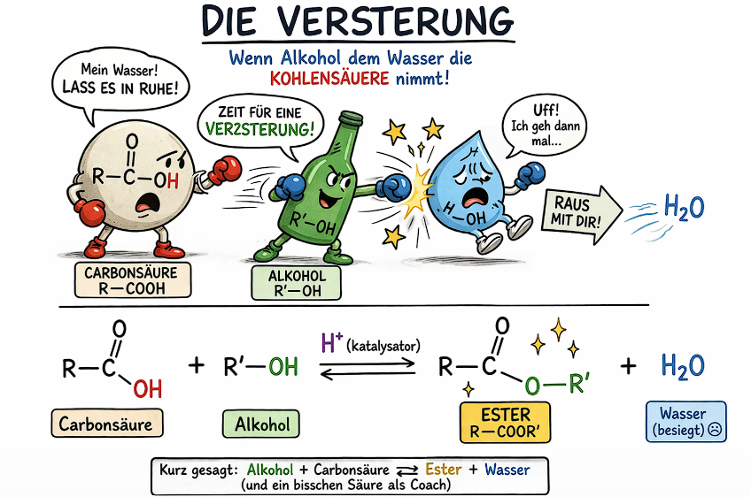 Du hast ein Team im Ring: eine Carbonsäure und ein Alkohol 🍋🍸 Die beiden gehören zusammen – die treten als Paar als eine Verbindung auf. Aber der dieser Alkohol 🍸? Sagen wir so… nicht der stärkste Partner. Also kommt der Wechsel: