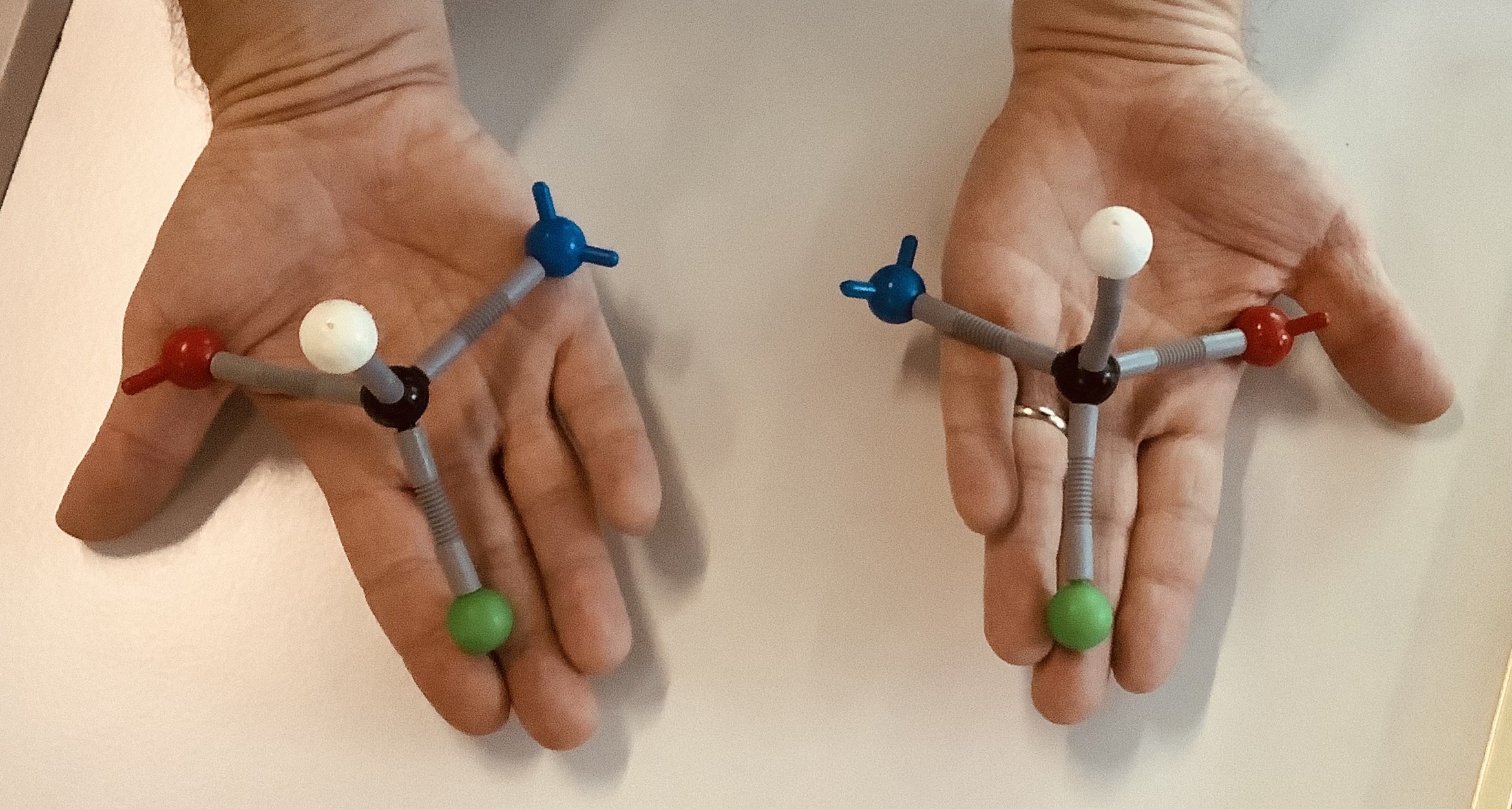 ✋ Ja. Linke und rechte Hand sehen ähnlich aus, passen aber nicht in denselben Handschuh. Dieses Prinzip gibt es auch bei Molekülen. C wie Chiralität – Spiegelbildliche Moleküle können unterschiedliche Wirkungen haben.